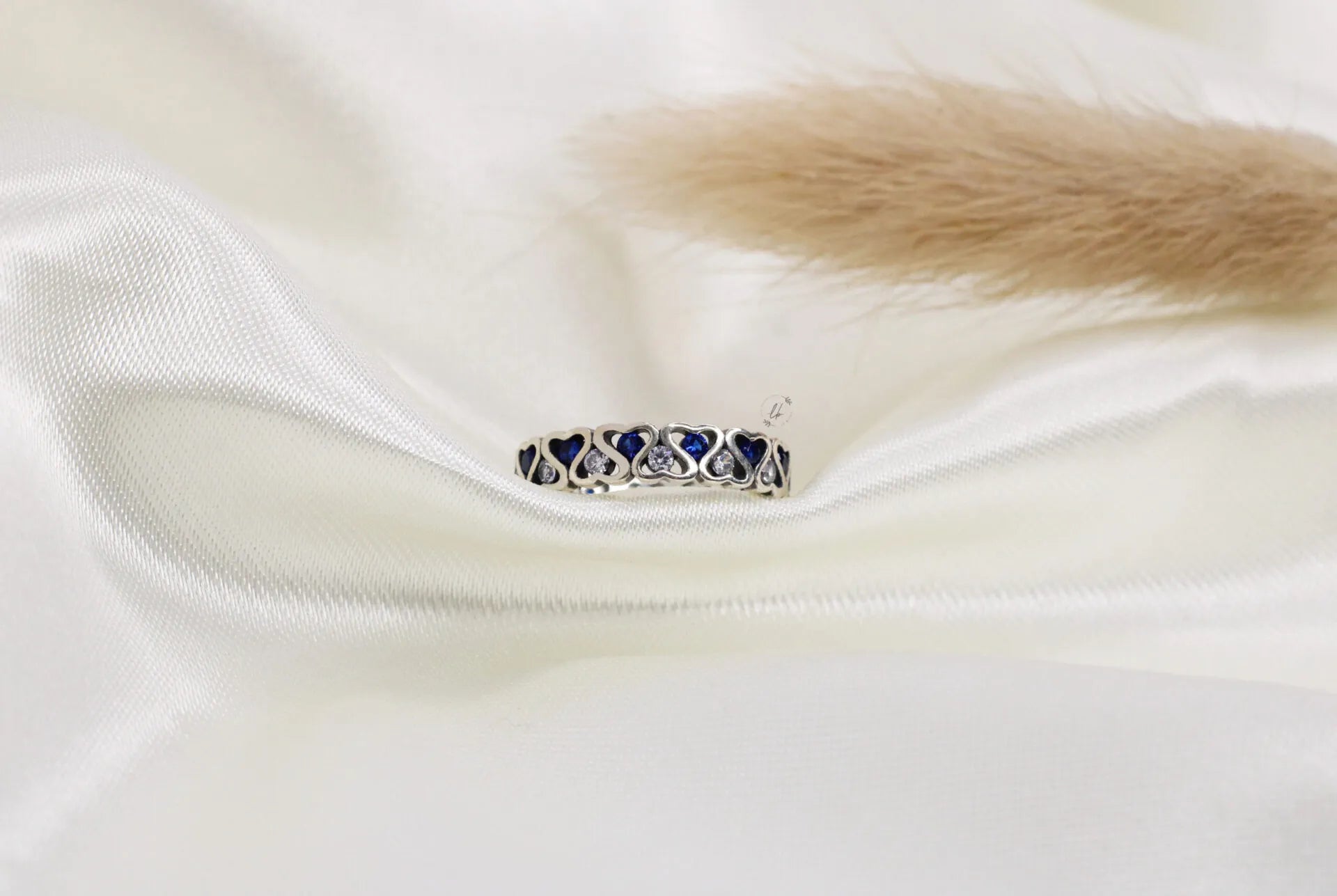 - Stone Design: Heart-shaped alternating blue and white cubic zirconia stones