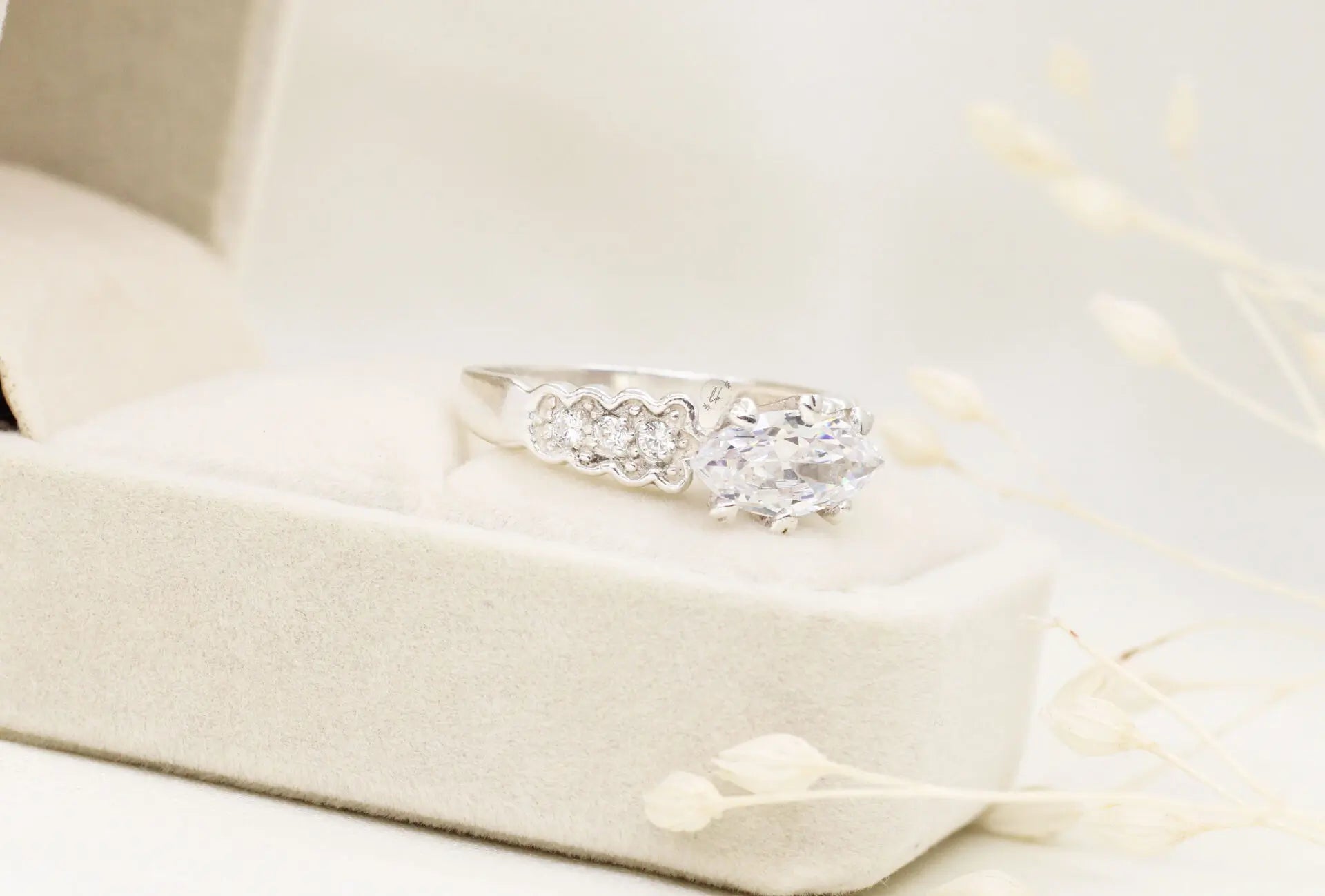 - Center Stone: Almond-cut cubic zirconia with exquisite brilliance