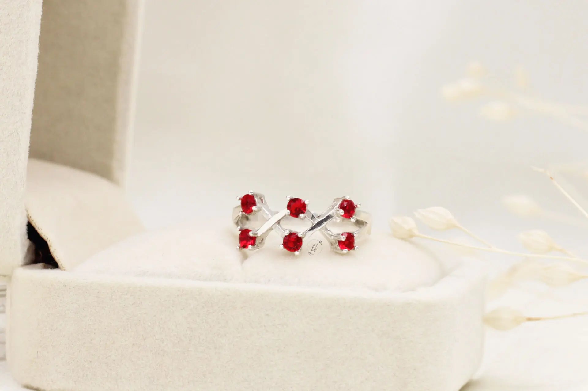 Carefully crafted from premium sterling silver, the ring features six radiant red gemstones that shimmer with every movement, creating a striking visual impact. Whether worn as a statement piece or layered with other rings, this masterpiece is perfect for elevating your everyday style or complementing formal attire.