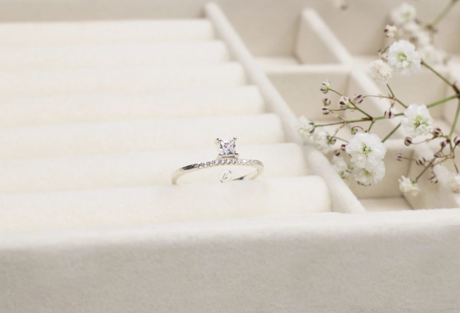 - Center Stone: Princess-cut cubic zirconia for an elegant, timeless look